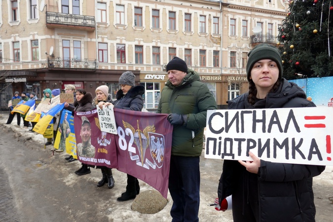 Activists hold placards and banners during the "Do Not Be Silent! Captivity Kills" rally to remind people about the prisoners of war from the Mariupol garrison, all captive and missing defenders of Ukraine in Shandora Petefi Square in Uzhhorod, Ukraine, January 25, 2026., Credit:Yulii Zozulia / Avalon