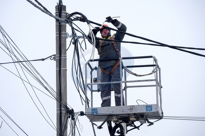 A power engineer of DTEK works on an aerial platform to repair power grids in the Desnianskyi district of Kyiv, Ukraine, on January 26, 2026. Electricity supply in the capital remains challenging, especially in the Dniprovskyi and Desnianskyi districts, as energy workers continue intensified efforts to restore equipment damaged by Russian shelling, Credit:Danylo Antoniuk / Avalon