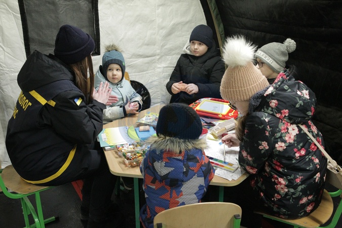A psychologist of the State Emergency Service of Ukraine talks with children at a mobile warming center in the Desnianskyi district of Kyiv, Ukraine, on January 26, 2026. The center was deployed due to disruptions in electricity and heating supply following Russian attacks on Ukraine's energy infrastructure, Credit:Hennadii Minchenko / Avalon