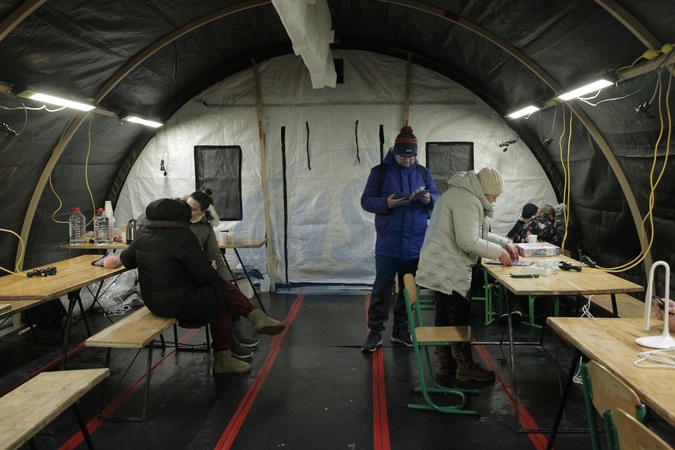 Local residents visit a mobile warming center deployed in the Desnianskyi district of Kyiv, Ukraine, on January 26, 2026. The center was set up due to disruptions in electricity and heating supply following Russian attacks on Ukraine's energy infrastructure, Credit:Hennadii Minchenko / Avalon