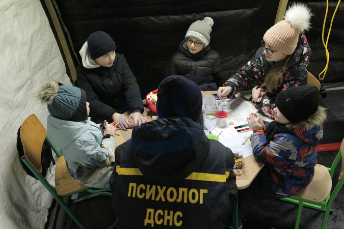 A psychologist of the State Emergency Service of Ukraine talks with children at a mobile warming center in the Desnianskyi district of Kyiv, Ukraine, on January 26, 2026. The center was deployed due to disruptions in electricity and heating supply following Russian attacks on Ukraine's energy infrastructure, Credit:Hennadii Minchenko / Avalon