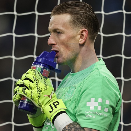 Everton goalkeeper Jordan Pickford drinks from his water bottle with penalty statistics attached during the Premier League match Everton vs Leeds United at Hill Dickinson Stadium, Liverpool, United Kingdom, 26th January 2026, Credit:Ae Cosgrove/News Images / Avalon