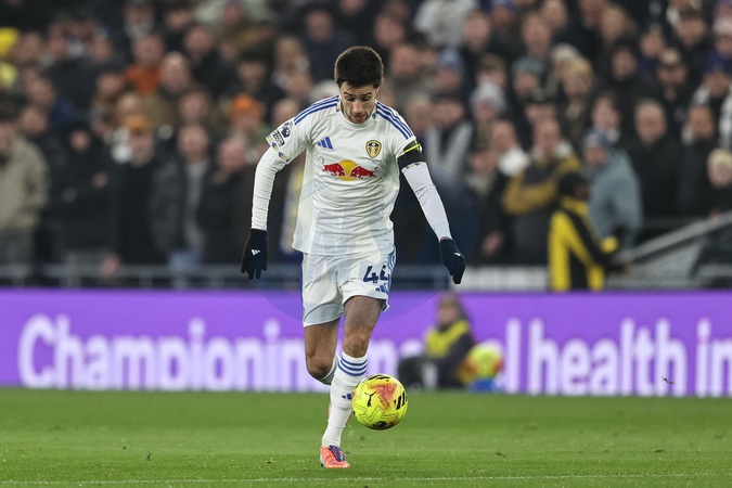 Ilia Gruev of Leeds United breaks with the ball during the Premier League match Everton vs Leeds United at Hill Dickinson Stadium, Liverpool, United Kingdom, 26th January 2026, Credit:Ae Cosgrove/News Images / Avalon
