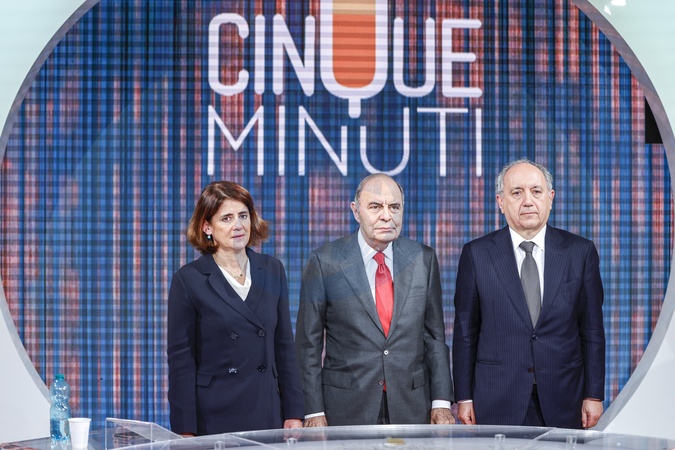26701/2026 Rome, Rai1, television program Cinque Minuti, in the photo Bruno Vespa with Gianlorenzo Cornado Italian Ambassador to Switzerland and Carla Scotto, mother of Riccardo Minghetti, Credit:Cristiano Minichiello / Avalon