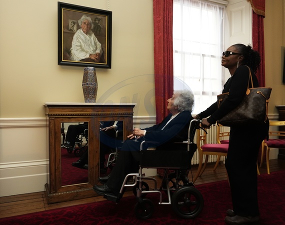 Anita Lasker-Wallfisch, the last remaining survivor of the Women's Orchestra of Auschwitz, looking at a portrait of herself during a reception at Buckingham Palace in London to mark Holocaust Memorial Day. Picture date: Tuesday January 27, 2026., Credit:Aaron Chown / Avalon