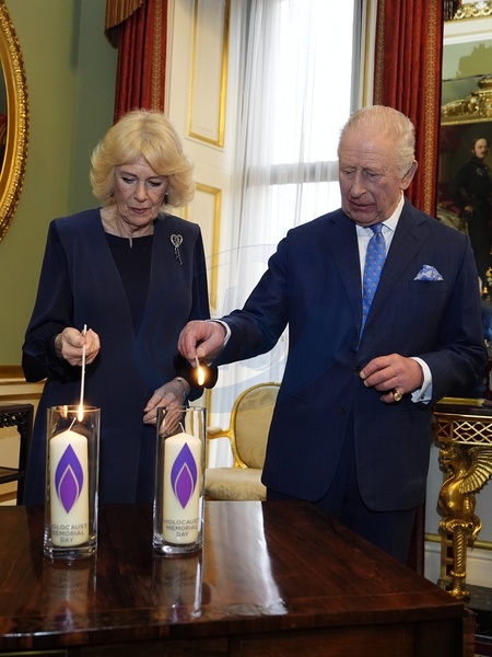 King Charles III and Queen Camilla light candles during a reception at Buckingham Palace in London to mark Holocaust Memorial Day. Picture date: Tuesday January 27, 2026., Credit:Aaron Chown / Avalon