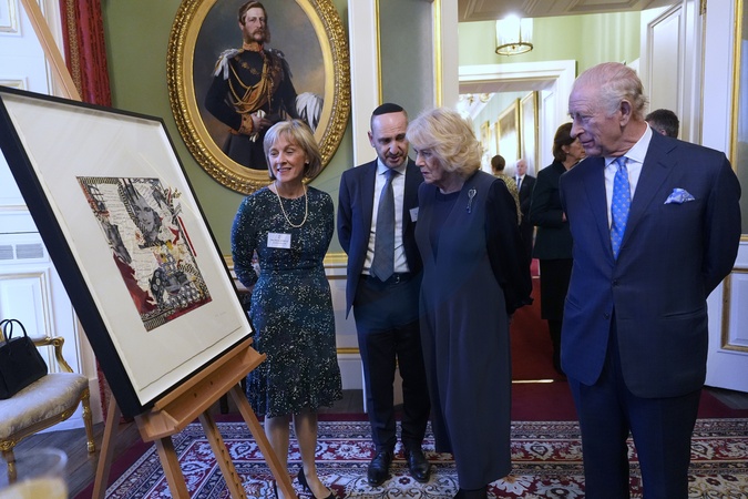 King Charles III and Queen Camilla viewing the Anne Frank portrait by Peter Sacks, with Nicola Cobbold (left) and Dan Green (second left) from the Anne Frank Trrust during a reception at Buckingham Palace in London to mark Holocaust Memorial Day. Picture date: Tuesday January 27, 2026., Credit:Aaron Chown / Avalon