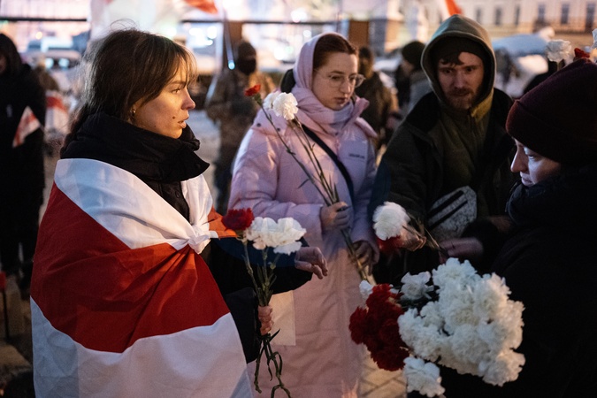 People hand out flowers during a commemoration event honoring Belarusian volunteers killed in the Russian-Ukrainian war at Mykhailivska Square, Kyiv, Ukraine, on January 26, 2026, Credit:Danylo Antoniuk / Avalon