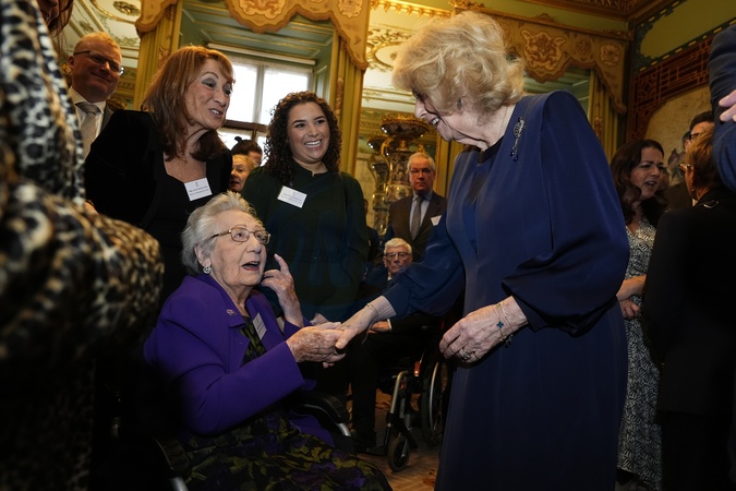 RETRANSMITTING AMENDING NAME TO ARONSON Queen Camilla speaks with Holocaust survivor Helen Aronson during a reception at Buckingham Palace in London to mark Holocaust Memorial Day. Picture date: Tuesday January 27, 2026., Credit:Aaron Chown / Avalon