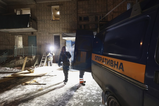 A repair crew cuts OSB boards for the temporary replacement of blown-out windows in an apartment building damaged by Russian shelling in Kharkiv, Ukraine, on January 26, 2026. On Monday evening, January 26, the city suffered a combined Russian attack. The strike injured three people and damaged two schools, apartment buildings and an energy infrastructure facility in the Industrialnyi district, causing electricity outages and the introduction of emergency blackout schedules in the region, Credit:Viacheslav Madiievskyi / Avalon