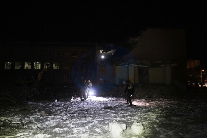 Police officers examine the area surrounding a school partially destroyed by Russian shelling in Kharkiv, Ukraine, on January 26, 2026. On Monday evening, January 26, the city suffered a combined Russian attack. The strike injured three people and damaged two schools, apartment buildings and an energy infrastructure facility in the Industrialnyi district, causing electricity outages and the introduction of emergency blackout schedules in the region, Credit:Viacheslav Madiievskyi / Avalon