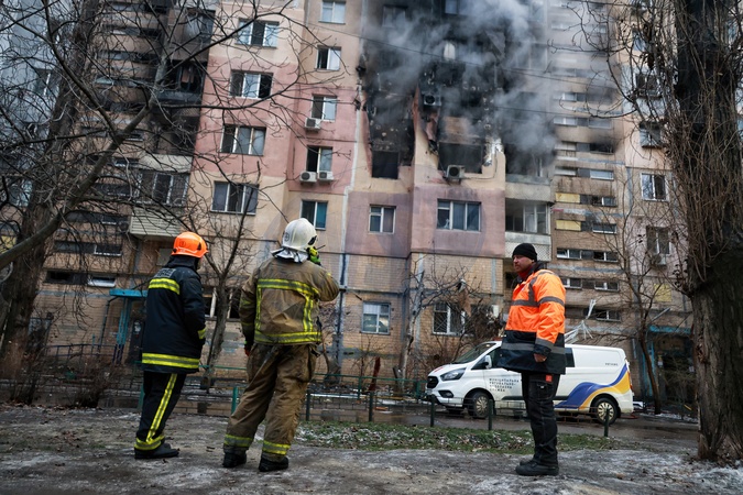 Black smoke rises from apartments of a nine-storey residential building as firefighters stand outside following a Russian drone strike on Odesa, Ukraine, on January 27, 2026. An overnight Russian drone attack on January 27 left Odesa with significant infrastructure damage. Authorities reported 22 affected people, 14 of whom sustained minor injuries. Search and rescue work continues at the strike sites, Credit:Nina Liashonok / Avalon