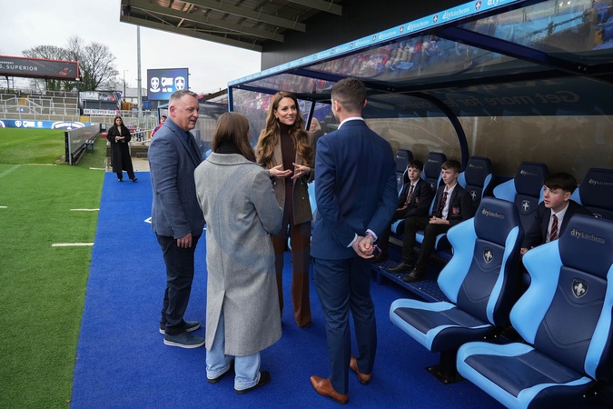 27/01/2026. Wakefield, UK. The Princess of Wales during a visit to Wakefield Trinity Rugby League club. Her Royal Highness met Marc Lovering, the RFL's Director of Performance and Development. The Princess then joined a session with the In Touch programme, which provides an open space for elderly people within the local community to help tackle social isolation by hosting quizzes, workshops and stadium tours. The Princess also met with young people from Wakefield's Inspiring Futures programme, which supports those who are at risk of anti-social behaviour and youth crime through goal setting, stress management, and teamwork. Finally, Her Royal Highness headed out to the rugby pitch and joined a skills session with girls from Wakefield's Champion Schools competition., Credit:Pete Maclaine / Avalon