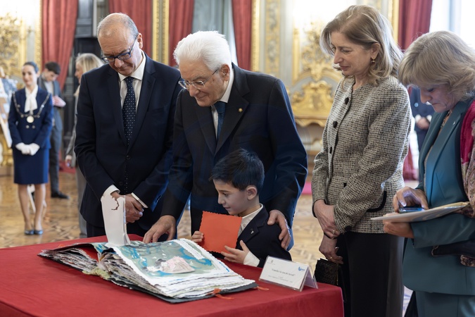 January 27, 2026, Rome, Quirinale Palace. President of the Republic Sergio Mattarella observes the works of the student winners of the "Young People Remember the Holocaust" competition. Rome, Italy 27 January 2026, Credit:Francesco Ammendola / Avalon