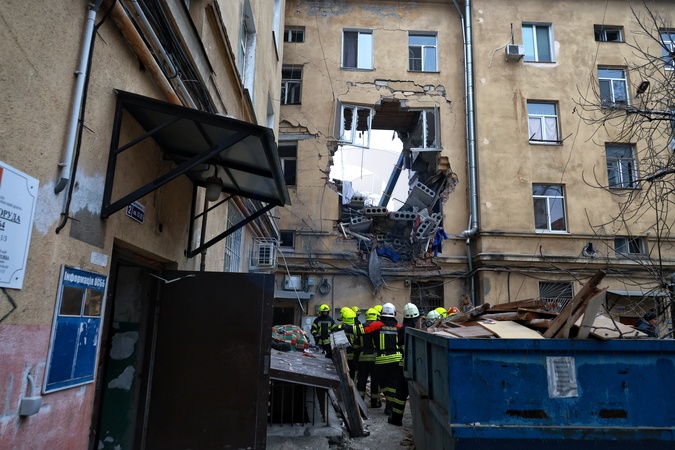 Rescuers and municipal workers clear rubble in search of survivors at an apartment block, where flats from the second to fourth floors collapsed following a Russian drone strike, Odesa, Ukraine, January 27, 2026. The large-scale overnight attack destroyed or damaged dozens of apartments, shattered facades and windows, and left three people dead., Credit:Nina Liashonok / Avalon