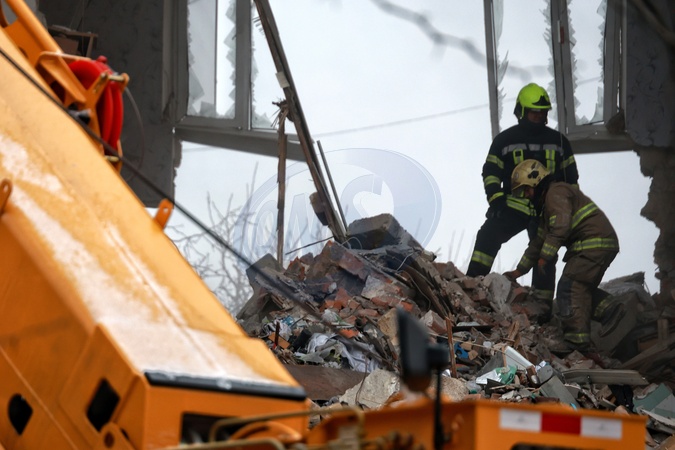 Rescuers and municipal workers clear rubble in search of survivors at an apartment block, where flats from the second to fourth floors collapsed following a Russian drone strike, Odesa, Ukraine, January 27, 2026. The large-scale overnight attack destroyed or damaged dozens of apartments, shattered facades and windows, and left three people dead., Credit:Nina Liashonok / Avalon