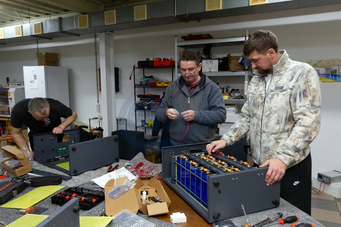 Veterans assemble large-capacity batteries in the workshop of a company founded by Oleksandr Tolochenko together with fellow veterans from the Tytanovi Rehabilitation Center, Kyiv, Ukraine, January 27, 2026. The enterprise focuses on producing backup and autonomous power supply systems., Credit:Kyrylo Chubotin / Avalon