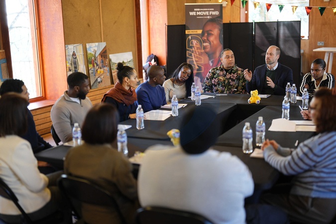 The Prince of Wales takes part in a roundtable discussion during a visit to BBC Children In Need's We Move FWD programme at the Ubele Initiative in the Wolves Lane Centre, north London. We Move FWD is a 10-year commitment by BBC Children in Need, delivered in collaboration with BBC Radio 1Xtra, to create opportunities for Black children and young people across the UK. Picture date: Wednesday January 28, 2026., Credit:Aaron Chown / Avalon
