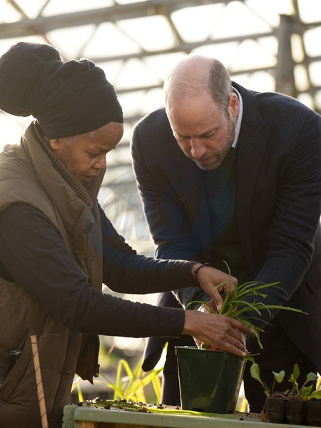 Paulette Henry from Black Rootz and the Prince of Wales in one of the greenhouses during a visit to BBC Children In Need's We Move FWD programme at the Ubele Initiative in the Wolves Lane Centre, north London. We Move FWD is a 10-year commitment by BBC Children in Need, delivered in collaboration with BBC Radio 1Xtra, to create opportunities for Black children and young people across the UK. Picture date: Wednesday January 28, 2026., Credit:Aaron Chown / Avalon