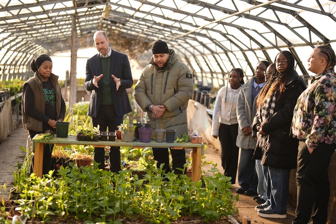(left to right) Paulette Henry from Black Rootz, the Prince of Wales and Big Zuu with young people from the Humber All Nations Alliance in one of the greenhouses during a visit to BBC Children In Need's We Move FWD programme at the Ubele Initiative in the Wolves Lane Centre, north London. We Move FWD is a 10-year commitment by BBC Children in Need, delivered in collaboration with BBC Radio 1Xtra, to create opportunities for Black children and young people across the UK. Picture date: Wednesday January 28, 2026., Credit:Aaron Chown / Avalon