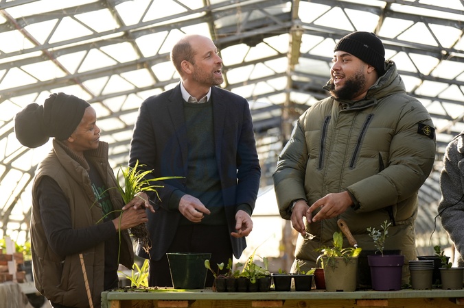 (left to right) Paulette Henry from Black Rootz, the Prince of Wales and Big Zuu in one of the greenhouses during a visit to BBC Children In Need's We Move FWD programme at the Ubele Initiative in the Wolves Lane Centre, north London. We Move FWD is a 10-year commitment by BBC Children in Need, delivered in collaboration with BBC Radio 1Xtra, to create opportunities for Black children and young people across the UK. Picture date: Wednesday January 28, 2026., Credit:Aaron Chown / Avalon