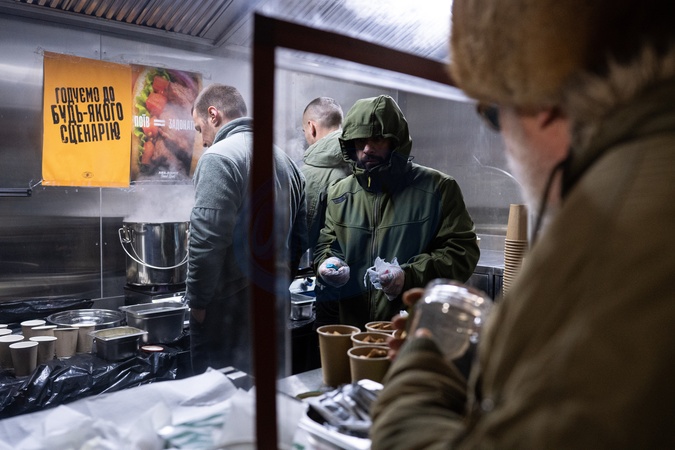 Volunteers from the "Angels” Patronage Service of the Third Army Corps, including war veterans and active military personnel, serve hot drinks from a food truck in the Obolonskyi district, Kyiv, Ukraine, January 27, 2026. Russian strikes on Ukraine's energy facilities have left the capital facing severe power and heating shortages, with emergency outages in place across the city., Credit:Danylo Antoniuk / Avalon