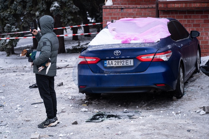 A man holding a dog takes photos of the aftermath of a Russian drone attack in the Holosiivskyi district with a smartphone, Kyiv, Ukraine, January 28, 2026., Credit:Danylo Antoniuk / Avalon