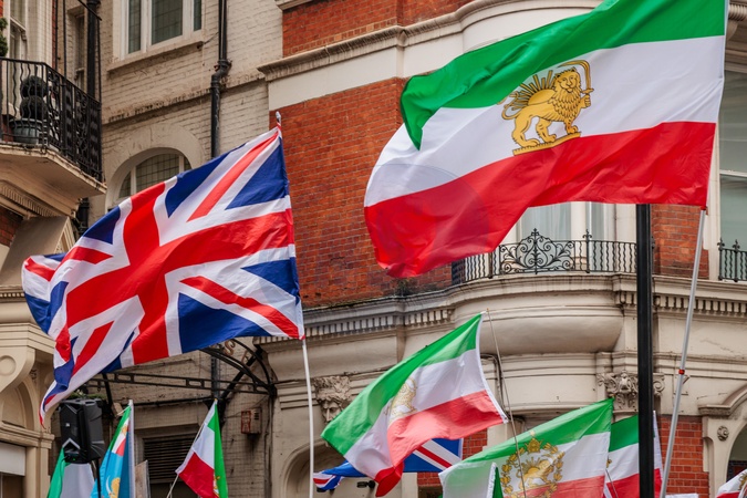 Iranian Embassy, London, UK. 25th January 2026.Activists and members of the Iranian community march through London in support of demonstrations in Iran. Waving Imperial Lion and Sun Iranian flags alongside GB Union Jack flags, Israeli flags and American flags, they are urging US President Trump to keep his promise to support the Iranian people against the violence and repression by the Islamic Republic regime and for the UK government put the Islamic Revolutionary Guard Corps (IRGC) on the list of terrorist organisations and shut down the Islamic Regime Embassy., Credit:Photo by Amanda Rose / Avalon