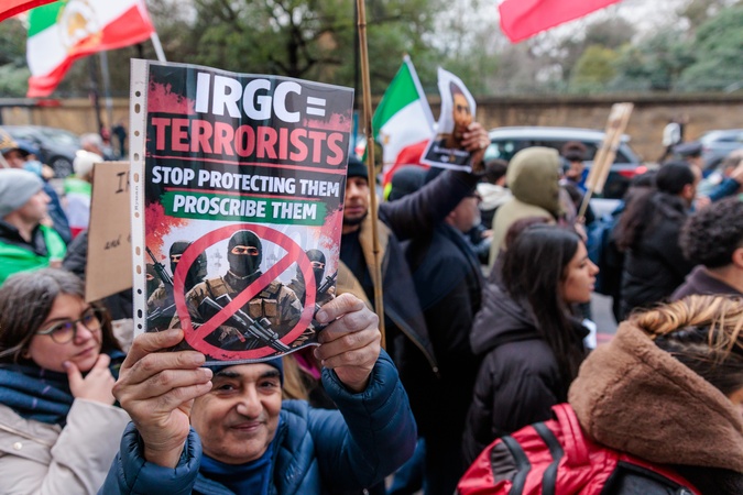 Iranian Embassy, London, UK. 25th January 2026.Activists and members of the Iranian community march through London in support of demonstrations in Iran. Waving Imperial Lion and Sun Iranian flags alongside GB Union Jack flags, Israeli flags and American flags, they are urging US President Trump to keep his promise to support the Iranian people against the violence and repression by the Islamic Republic regime and for the UK government put the Islamic Revolutionary Guard Corps (IRGC) on the list of terrorist organisations and shut down the Islamic Regime Embassy., Credit:Photo by Amanda Rose / Avalon