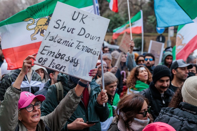 Iranian Embassy, London, UK. 25th January 2026.Activists and members of the Iranian community march through London in support of demonstrations in Iran. Waving Imperial Lion and Sun Iranian flags alongside GB Union Jack flags, Israeli flags and American flags, they are urging US President Trump to keep his promise to support the Iranian people against the violence and repression by the Islamic Republic regime and for the UK government put the Islamic Revolutionary Guard Corps (IRGC) on the list of terrorist organisations and shut down the Islamic Regime Embassy., Credit:Photo by Amanda Rose / Avalon