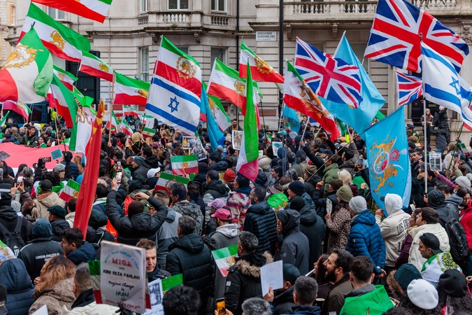 Iranian Embassy, London, UK. 25th January 2026.Activists and members of the Iranian community march through London in support of demonstrations in Iran. Waving Imperial Lion and Sun Iranian flags alongside GB Union Jack flags, Israeli flags and American flags, they are urging US President Trump to keep his promise to support the Iranian people against the violence and repression by the Islamic Republic regime and for the UK government put the Islamic Revolutionary Guard Corps (IRGC) on the list of terrorist organisations and shut down the Islamic Regime Embassy., Credit:Photo by Amanda Rose / Avalon
