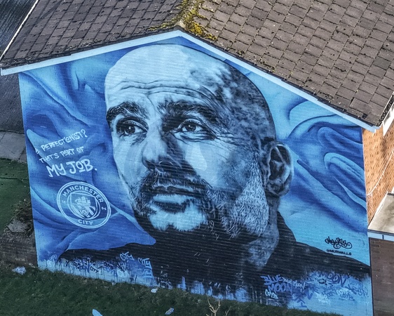 Pep Guardiola manager of Manchester City mural on a fans house during the UEFA Champions League match Manchester City vs Galatasaray at The City of Manchester Stadium, Manchester, United Kingdom, 28th January 2026, Credit:Mark Cosgrove/News Images / Avalon