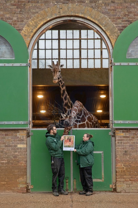 London Zoo's giraffes peer at a new London Underground poster in which they star, as ZSL marks 200 years. The new poster, designed by Eliza Southwood, is the grand finale of London Transport Museum and TfL's ‘Great days out' poster series that celebrates renowned cultural attractions in the capital, including Dulwich Picture Gallery, London Transport Museum in Covent Garden and the Royal Albert Hall in South Kensington. Posters and 30x40cm artwork prints will be available to buy from London Zoo or through ZSL's online shop at https://shop.zsl.org/. Picture date: Friday January 23, 2026., Credit:Johnny Green / Avalon