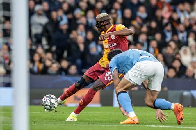 Victor Osimhen of Galatasaray takes a shot on goal during the UEFA Champions League Matchday 8 of 8 match Manchester City vs Galatasaray at City of Manchester Stadium, Manchester, United Kingdom on 28 January 2026, Credit:Mark Cosgrove/News Images / Avalon