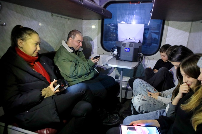 People charge mobile phones inside an invincibility wagon installed at the railway station in Vyshneve as part of a joint initiative by Ukrzaliznytsia and the Kyiv Regional Military Administration to support residents during power and heating outages caused by Russian attacks on Ukraine's energy facilities, Vyshneve, Kyiv region, Ukraine, on January 28, 2026, Credit:Volodymyr Tarasov / Avalon