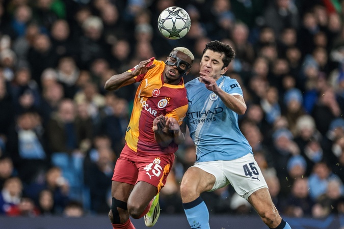 Victor Osimhen of Galatasaray and Abdukodir Khusanov of Manchester City battle for the ball during the UEFA Champions League Matchday 8 of 8 match Manchester City vs Galatasaray at City of Manchester Stadium, Manchester, United Kingdom on 28 January 2026, Credit:Mark Cosgrove/News Images / Avalon
