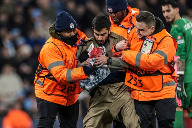 Protesters breach the field during the UEFA Champions League Matchday 8 of 8 match Manchester City vs Galatasaray at City of Manchester Stadium, Manchester, United Kingdom on 28 January 2026, Credit:Mark Cosgrove/News Images / Avalon