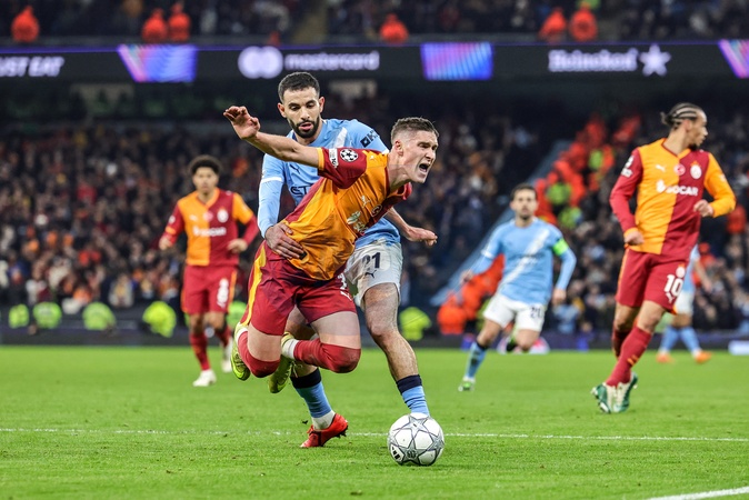 Roland Sallai of Galatasaray fouled by Rayan Ait-Nouri of Manchester City during the UEFA Champions League Matchday 8 of 8 match Manchester City vs Galatasaray at City of Manchester Stadium, Manchester, United Kingdom on 28 January 2026, Credit:Mark Cosgrove/News Images / Avalon