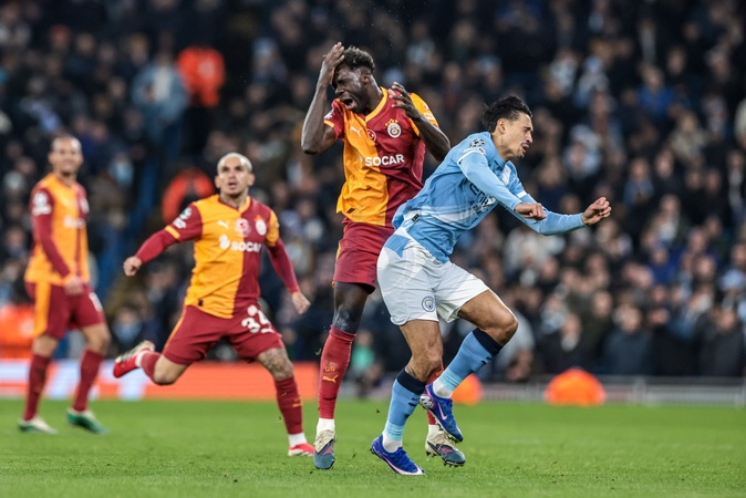 Davinson Sanchez of Galatasaray clashes heads with Tijjani Reijnders of Manchester City during the UEFA Champions League Matchday 8 of 8 match Manchester City vs Galatasaray at City of Manchester Stadium, Manchester, United Kingdom on 28 January 2026, Credit:Mark Cosgrove/News Images / Avalon