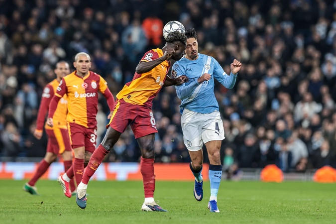 Davinson Sanchez of Galatasaray clashes heads with Tijjani Reijnders of Manchester City during the UEFA Champions League Matchday 8 of 8 match Manchester City vs Galatasaray at City of Manchester Stadium, Manchester, United Kingdom on 28 January 2026, Credit:Mark Cosgrove/News Images / Avalon