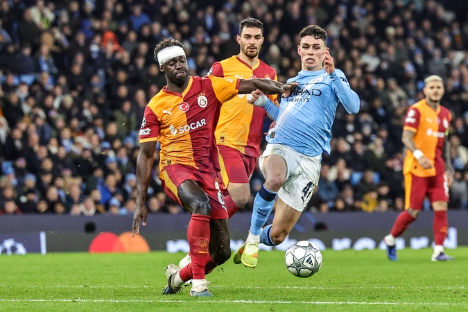 Davinson Sanchez of Galatasaray and Phil Foden of Manchester City battle for the ball during the UEFA Champions League Matchday 8 of 8 match Manchester City vs Galatasaray at City of Manchester Stadium, Manchester, United Kingdom on 28 January 2026, Credit:Mark Cosgrove/News Images / Avalon