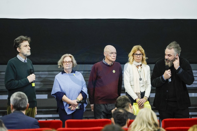 28/01/2026 Rome, Nuovo Cinema Sacher, presentation of the documentary on Giulio Regeni, in the photo from left Nanni Moretti with Paola Deffendi, Claudio Regeni, Alessandra Ballerini lawyer, Simone Manetti director, Matteo Billi and Emanuele Cava, Credit:Cristiano Minichiello / Avalon