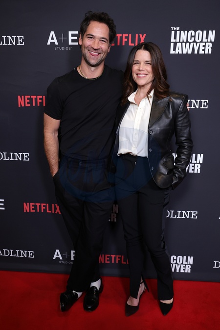 28 January 2026 . Los Angeles, California Manuel Garcia-Rulfo and Neve Campbell At the Premiere Celebration Of "The Lincoln Lawyer" Season 4 hheld at PMC Rooftop Terrace in Los Angeles., Credit:Sadou Faye / Avalon