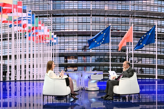Rai1, television program Porta a Porta. Pictured is journalist Bruno Vespa with Roberta Metsola, President of the European Parliament. Rome, Italy 29 Janauary 2026, Credit:Maria Laura Antonelli / Avalon