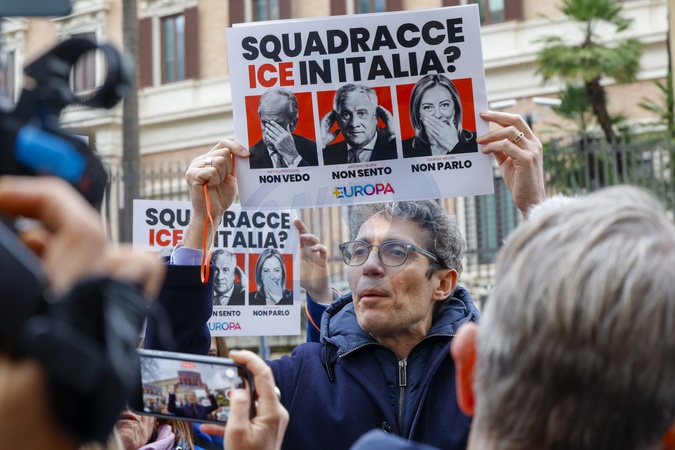 29/01/2026 Rome, Sit-in protest against the presence of the American ICE police at the Milan Cortina 2026 Olympics, in the photo Riccardo Magi holds a sign with an image of Giorgia Meloni, Antonio Tajani, Matteo Piantedosi., Credit:Cristiano Minichiello / Avalon