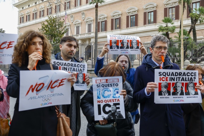 29/01/2026 Rome, Sit-in protest against the presence of the American ICE police at the Milan Cortina 2026 Olympics, in the photo Riccardo Magi holds a sign with an image of Giorgia Meloni, Antonio Tajani, Matteo Piantedosi., Credit:Cristiano Minichiello / Avalon