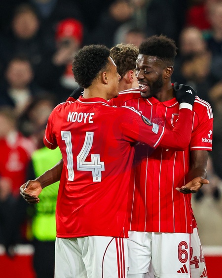 Ibrahim Sangare of Nottingham Forest and Dan Ndoye of Nottingham Forest celebrates an own goal by Bence Otvos of Ferencváros to make it 1-0 during the UEFA Europa League Matchday 8 of 8 Nottingham Forest vs Ferencvaros at City Ground, Nottingham, United Kingdom, 29th January 2026, Credit:Ae Cosgrove/News Images / Avalon