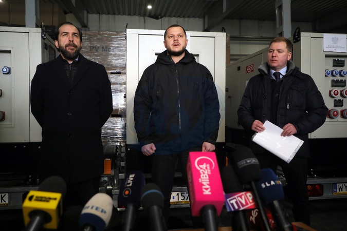 Charge d'affaires a.i. of the Republic of Poland in Ukraine Piotr Lukasiewicz, Kyiv Regional Military Administration head Mykola Kalashnyk and Deputy Minister for Communities and Territories Development of Ukraine Artem Rybchenko (L to R) participate in the transfer of 350 generators from Poland and boilers from the Italian government to Kyiv and communities across Ukraine to help overcome the energy crisis caused by Russian strikes on critical infrastructure, Kyiv region, Ukraine, January 29, 2026., Credit:Yuliia Ovsiannikova / Avalon