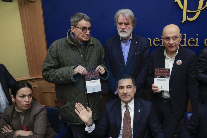 January 30, 2026, Rome. Protests erupted at the Remigration and Reconquest Committee press conference in the Chamber of Deputies Press Room. The conference was later canceled for security reasons. Pictured is Lega MP Domenico Furgiuele, being protested by center-left MPs., Credit:Richard De Luca / Avalon