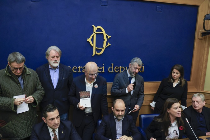 January 30, 2026, Rome. Protests erupted at the Remigration and Reconquest Committee press conference in the Chamber of Deputies Press Room. The conference was later canceled for security reasons. Pictured is Lega MP Domenico Furgiuele, being protested by center-left MPs., Credit:Richard De Luca / Avalon